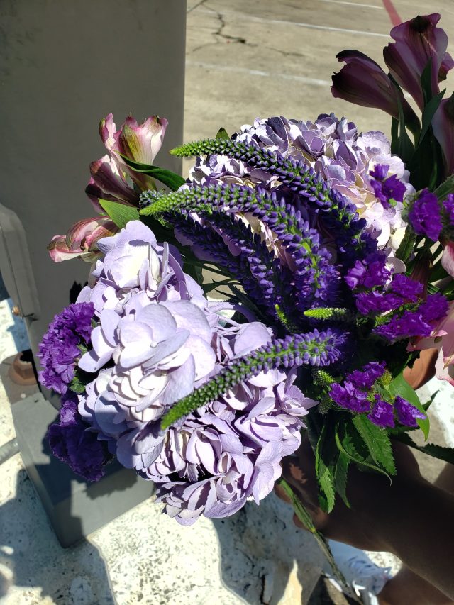 On Wednesday afternoon we picked up a bouquet of flowers (the closest colors I could get to our wedding flowers) and we went to the parking lot to mark his last breath: